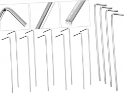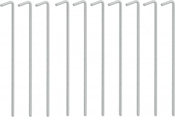 Det praktiske sæt med 10 stålspløkker med L-ende er ideelt til camping, haven og vandring. Takket være 4 mm i diameter og 24 cm i længde sidder pløkkerne sikkert i græs, jord og grus og forhindrer, at snore eller stropper løsner sig. Den enkle form gør det let at hamre dem i og trække dem op igen.