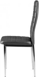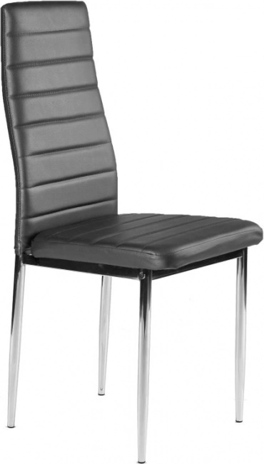 Gråt økolæderbetræk og forkromede ben skaber en elegant kombination, der passer ind i moderne spisestuer, køkkener og offentlige rum.