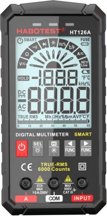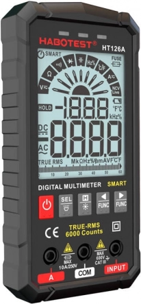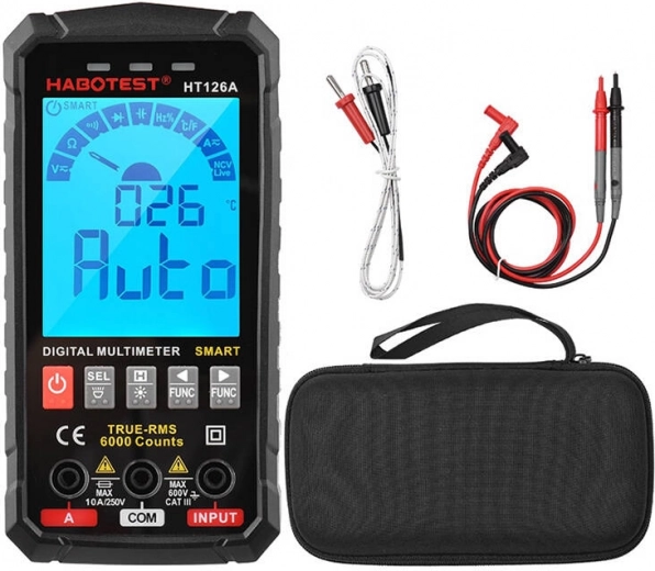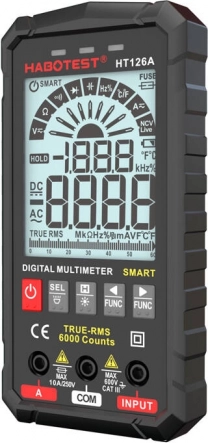 Det digitale multimeter Habotest HT126A er designet til præcise målinger og nem betjening. Det er udstyret med en stor LCD-skærm, som giver hurtig adgang til alle nødvendige måleoplysninger. Takket være de kompakte dimensioner og den lette konstruktion er det ideelt at have med på farten.