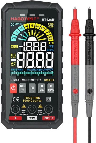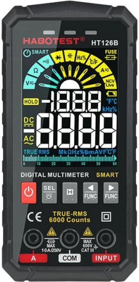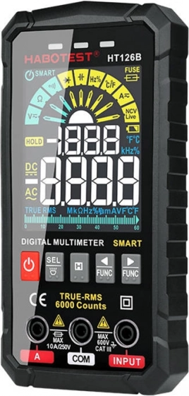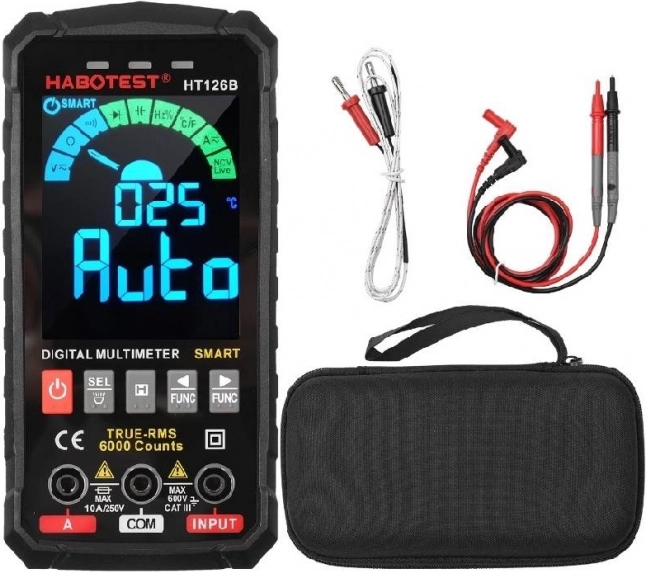 HABOTEST multimeteret er designet til præcis og komfortabel måling både i felten og på værkstedet. Takket være true‑RMS leverer det pålidelige resultater selv ved ikke-lineære forløb, 6000 counts sikrer fin opløsning, og stor VA-skærm med bagbelysning giver fremragende læsbarhed. Silikoneknapper, LED-lygte og et kompakt kabinet (ca. 146 × 72 × 26 mm, 182 g) øger komforten selv under krævende forhold.