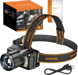 Den kraftige Superfire pandelampe leverer 700 lm lysstyrke, rækkevidde på 210 m og op til 8 lysindstillinger. Den byder på berøringsfri sensor til håndbevægelse, justerbar vippevinkel, opladning via USB-C, IP43 og batteritid op til 6,5 time. Tåler fald fra 1 m og er ideel til vandring, cykling og camping.