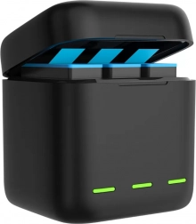 Den kompakte Telesin 3-slots oplader med etui oplader hurtigt og sikkert op til 3 batterier til GoPro HERO 12/11/10/9 samtidig. Den byder på hurtig opladning på 2,4 A, tydelige LED-indikatorer for status, USB‑C-forbindelse og omfattende beskyttelse mod overspænding, overbelastning og overophedning. Den lette konstruktion med magnetisk låg og silikonelomme til 2 microSD er ideel til rejser.