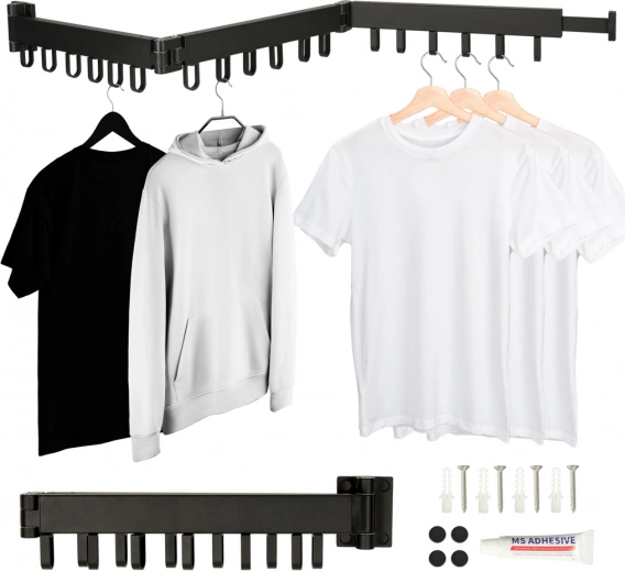 Det elegante vægmonterede tørrestativ i mat sort er en løsning til både små og større rum. Med fire nedklappelige arme med justerbar vinkel og teleskopisk udtræk kan du nemt tilpasse tørrefladen til det aktuelle behov. Den stabile konstruktion i holdbart aluminium sikrer lang levetid både indendørs og på altanen.