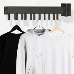 Skab orden derhjemme og få mere plads med et smart vægmonteret tørrestativ, der tilpasser sig dine behov. Den teleskopiske arm kan trækkes ud op til 90 cm, så den rummer flere stykker tøj på én gang, og efter tørring foldes den nemt ind mod væggen. Det minimalistiske, men robuste metaldesign passer perfekt i både moderne og klassiske hjem.