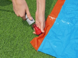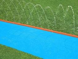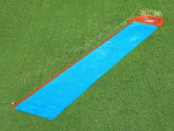 Denne rutsjebane er udstyret med et system af vandstråler, der sikrer optimal fugtning af overfladen og gør det let at glide. Integrerede stråler aktiveres ved at tilslutte haveslangen. Konstruktionen giver en blød og sikker afslutning takket være den oppustelige ende. Lavet af holdbar vinyl, garanterer lang levetid.