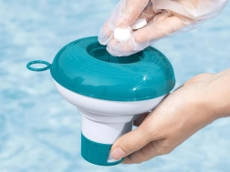 Den praktiske flydende klordispenser fra Bestway sørger for løbende dosering af poolkemi og holder vandet krystalklart hele sæsonen. Læg blot klortabletter med en diameter på op til 2,5 cm i (medfølger ikke), så opløser dispenseren dem sikkert og jævnt over hele overfladen.