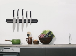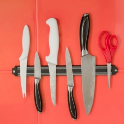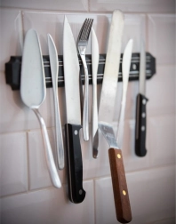 Én skinne – mange muligheder. Holder køkkenknive, piskeris, sakse og værktøj i værkstedet. Orden og overblik på lidt plads.
