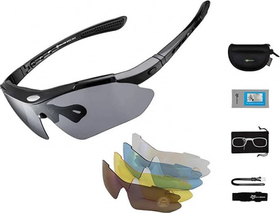 Let- og holdbare cykelbriller fra ROCKBROS med polariserede linser, der giver UV400-beskyttelse, reducerer blænding og forbedrer kontrast og synlighed. I sættet finder du 5 udskiftelige linser til forskellige forhold, pandebånd, snor, etui og pudseklud. Ideelle til cykling, løb og andre udendørsaktiviteter.