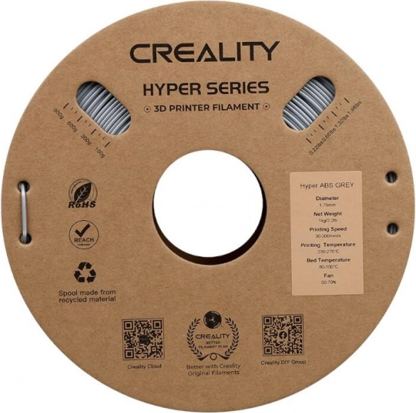 Meget hurtig og holdbar CREALITY Hyper ABS-filament i grå til krævende tekniske print. Tilbyder hastighed op til 350 mm/s, lav krympning uden revner og deformation samt høj slagstyrke 19 kJ/m². Ideel til funktionsdele, prototyper og industrielle applikationer, kompatibel med de fleste Creality-printere.
