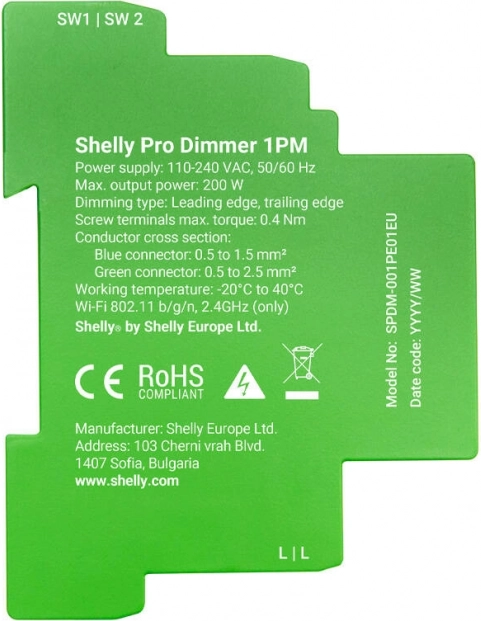 Gør din belysning smart. Shelly Pro Dimmer 1 er en enkeltkanals DIN-skinne-dæmper med Wi‑Fi-, Ethernet- og Bluetooth-forbindelse, som muliggør trinløs dæmpning, automatisering, ugentlige planer og fjernstyring uden behov for hub. Den tilbyder maks. 200 W, nattilstand og avancerede beskyttelser for sikker drift.
