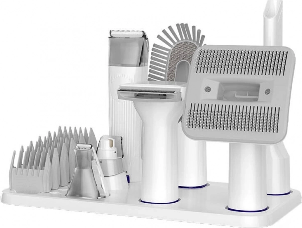 Pakken indeholder en præcisionstrimmer til hår mellem poter, klosliber og flere typer mundstykker til forskellige pelstyper og længder. Takket være den store 1,5 l beholder og praktisk opbevaring er vedligeholdelsen nem og hygiejnisk – en ideel løsning til daglig pleje derhjemme.
