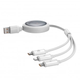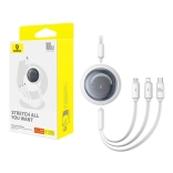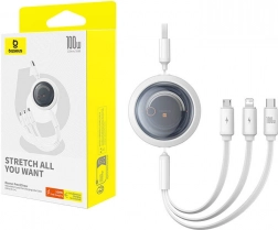 Det universelle udtrækkelige kabel BASEUS Free2Draw med USB‑C, Lightning og Micro USB‑stik gør det muligt at oplade op til 3 enheder samtidig. Takket være 100 W effekt og dataoverførsel på 480 Mb/s er det ideelt til telefoner, tablets og tilbehør. Den kompakte kabelopruller forhindrer kabelrod og gør det nemt at have med på farten.