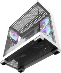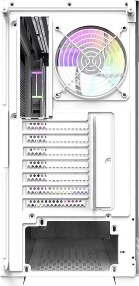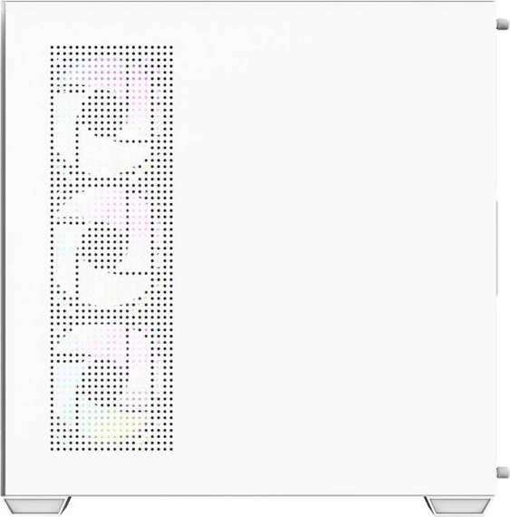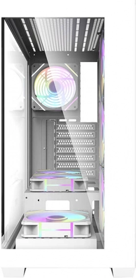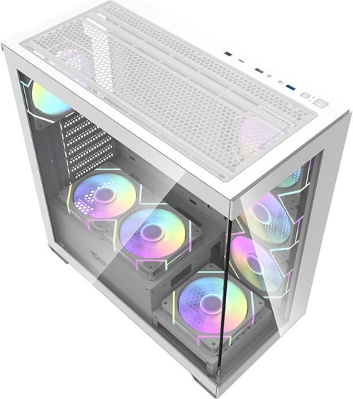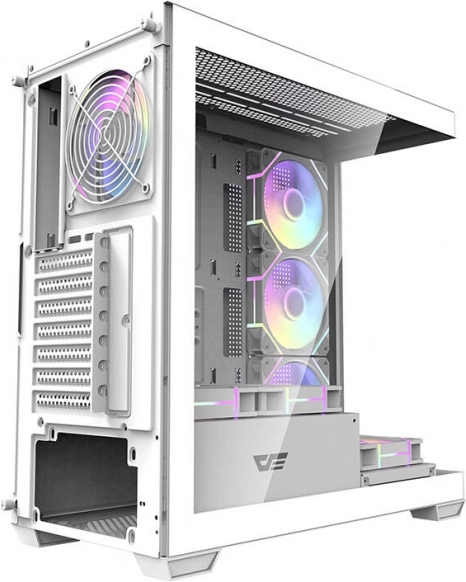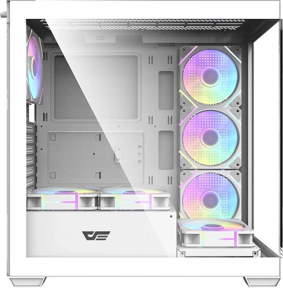 Elegant og rummeligt computerkabinet Darkflash DS900 i hvid farve med panoramisk design uden A‑stolpe, to sidepaneler af hærdet glas og allerede monterede 7 ARGB 120 mm blæsere. Leverer fremragende airflow, understøttelse af store 360 mm radiatorer, kompatibilitet med ATX/M‑ATX/ITX‑bundkort og nem udvidelse takket være 7 PCI‑slots og en gennemtænkt intern opbygning.