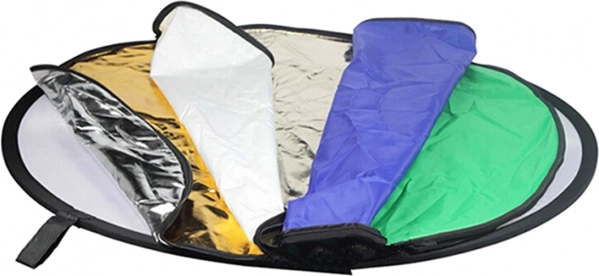 - 7 overflader: guld (varmer toner, øger kontrast), sølv (kraftig refleksion, lysstyrke), hvid (blød, jævn udfyldning), sort (absorberer lys, kontrol af skygger), blå og grøn (baggrund til chroma key), diffus (lysspredning).