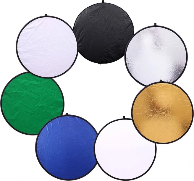 Universelt sæt til arbejde med lys: sammenfoldelig fotografisk reflektorskærm 7-i-1 med en diameter på 60 cm og integreret diffusor. Den tilbyder overflader i guld, sølv, hvid, sort, blå, grøn og diffus til perfekt styring af refleksioner, farvetemperatur og jævnhed i lyset både i studie og udendørs. Let, kompakt og robust – ideel til både professionelle og begyndere.
