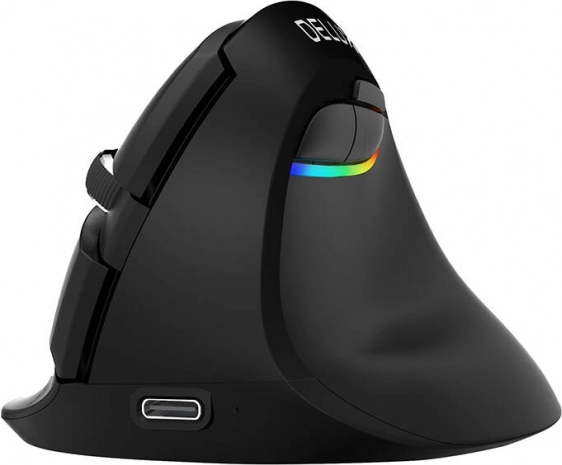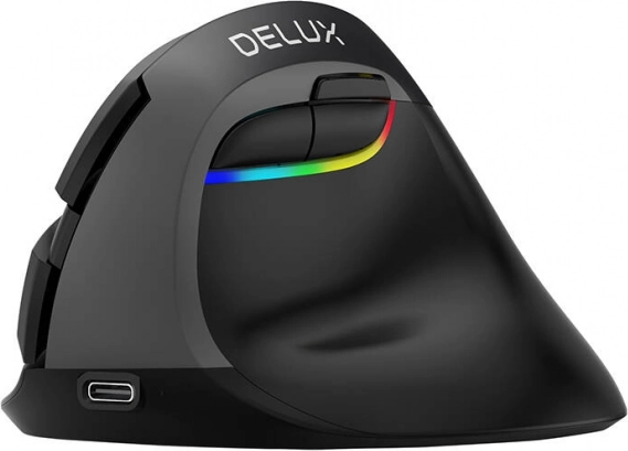 Oplev komfort og præcision med den lodrette Delux M618 Mini-mus. Dens ergonomiske design aflaster håndleddet, trådløs 2,4 GHz- og Bluetooth-forbindelse giver bevægelsesfrihed, og justerbar DPI op til 4000 sikrer præcis kontrol. Takket være stille knapper, et 500 mAh batteri med opladning via USB‑C og RGB-belysning er den ideel til både arbejde og studie.