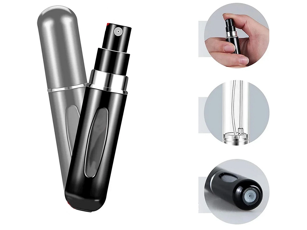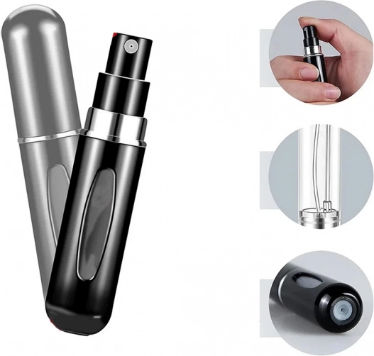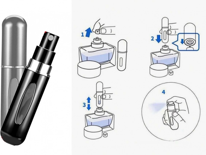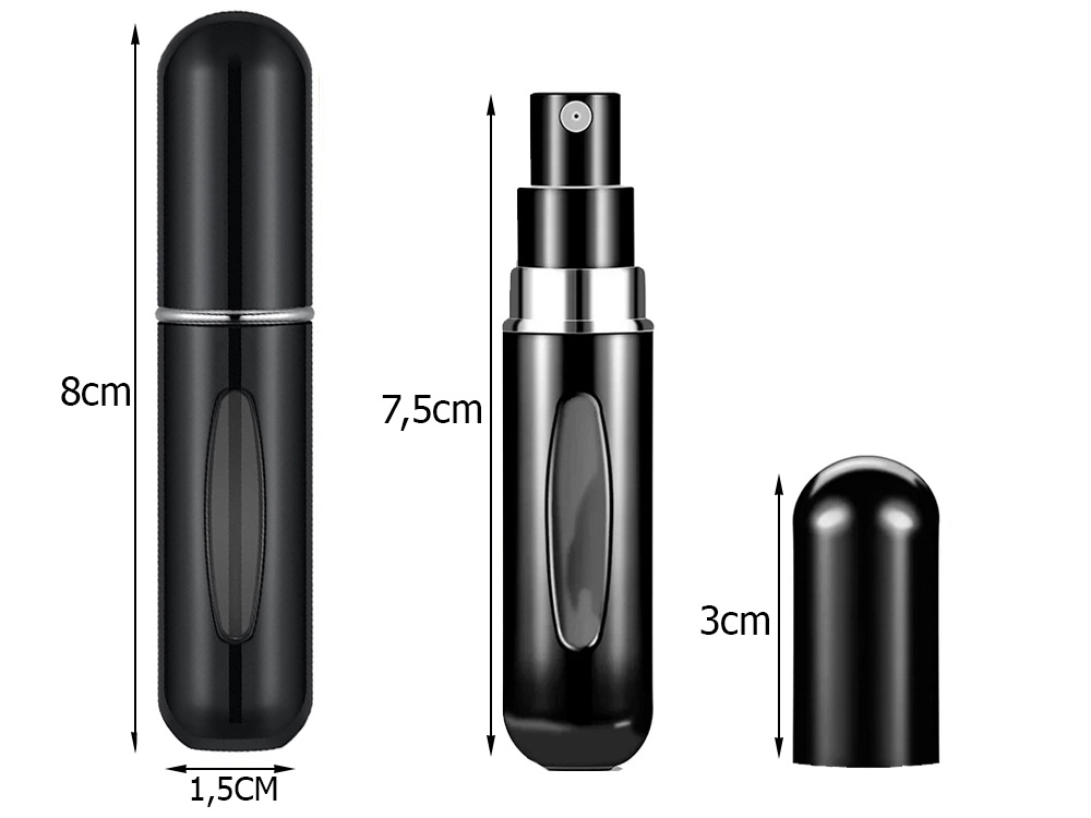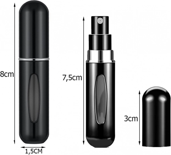 Påfyldning er hurtig og ren: fjern sprayhovedet fra den originale parfume, og skub atomizeren ned over røret på den mekaniske forstøver. Ved gentagne tryk fyldes beholderen hurtigt. Med de kompakte mål 8 × 1,5 cm passer den i lommen, en clutch eller håndbagagen.