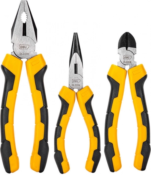 DELI-sættet med tre tænger er ideelt til værksted, hjem og service. Den solide konstruktion i højkulstofstål giver modstand mod slid, mens de skridsikre gul‑sorte håndtag giver et sikkert greb og komfort ved længere tids brug.