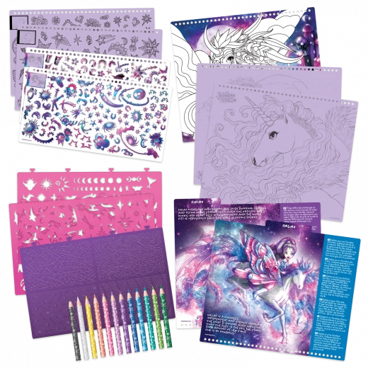 Oplev magien ved kreativt skaberi med Nebulous Stars malebøger i lilla. Dette rigt udstyrede sæt indeholder alt til at skabe magiske tegninger af fantasyheste – fra klistermærker og skabeloner til plastforme og farveblyanter. Ideelt til børn fra 7 år, som elsker fantasi, farver og fine detaljer. Skab dine egne stjernefortællinger og udvikl finmotorik og fantasi takket være 250 klistermærker, 80 skabeloner og 12 farveblyanter i én pakke.