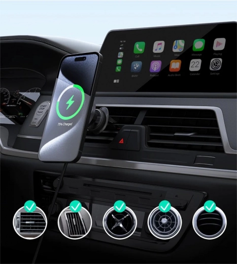 Magneterne holder telefonen stabil selv på ujævne veje, mens Qi2-standarden leverer op til 15 W for hurtig og effektiv trådløs opladning.