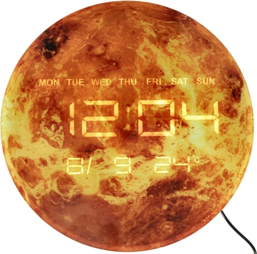 Designuret med realistisk grafik af planeten Mars bliver et blikfang i enhver indretning – fra børneværelset til kontoret. Det overskuelige LED-display tilbyder klokkeslæt i 12/24-timers format, dato (M/D/Å), ugedag på engelsk forkortelse samt aktuel temperatur i °C.