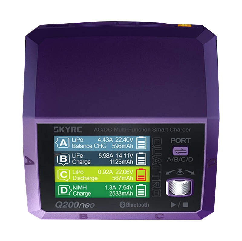SKYRC Q200neo giver hurtigere klargøring til flyvning og race: i AC‑tilstand leverer den op til 200 W og i DC op til 400 W, og op til 100 W pr. port. Ved brug af to porte på AC samler den effekten for maksimal ydelse, og ved fire porte fordeler den dynamisk efter behov. Aktiv køling og avanceret opladningsstyring (MCU, PID) holder temperatur og strøm under kontrol.