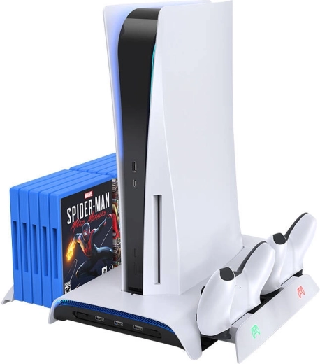 Der medfølger en dock-oplader til to DualSense-controllere med hurtig opladning – fuld kapacitet på ca. 3 timer. LED-indikator viser status tydeligt: rød = oplader, grøn = fuldt opladet. RGB-belysning (8 farver) gør det muligt at tilpasse looket efter humør eller spil, mens slots til spildiske hjælper med at holde orden og give hurtig adgang til dine titler.