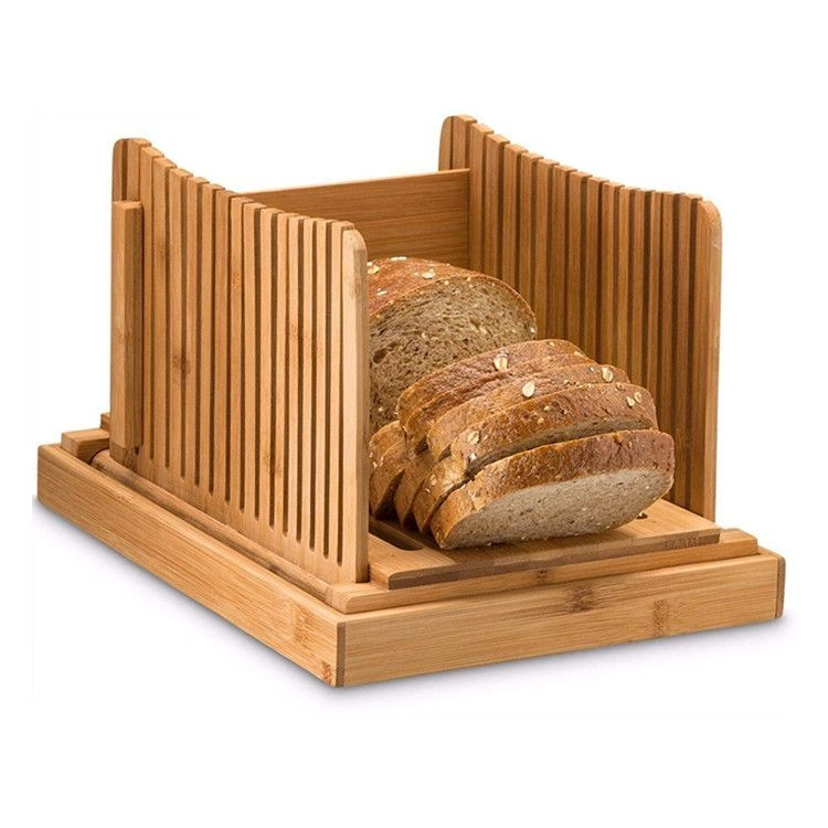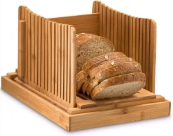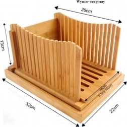 Den bambusbaserede brødskærer gør det muligt at skære jævne og sikre skiver af brød, baguette, deje m.m. Du behøver ikke bekymre dig om krummer på køkkenbordet, da den har en bakke, hvor krummerne samles. Krummerne kan nemt tømmes fra bakken. Den kompakte brødskærer fylder ikke meget og sparer værdifuld plads på køkkenbordet. Brødskæreren er lavet af kvalitets-bambustræ, som er fødevaresikkert. Skæreren er specielt designet, så en stor brødkniv passer i den.