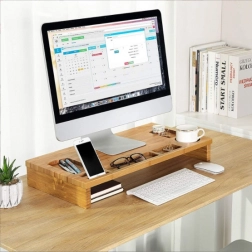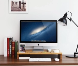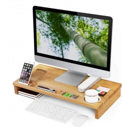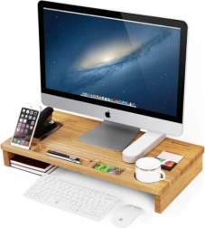 Opgrader din arbejdsplads med en stilfuld bambusstander, der kombinerer ergonomi og organisering. Ved at løfte skærmen til øjenhøjde reduceres belastning af nakke og ryg, mens gennemtænkte rum holder alt nødvendigt inden for rækkevidde – fra telefon og skriveredskaber til kruset.