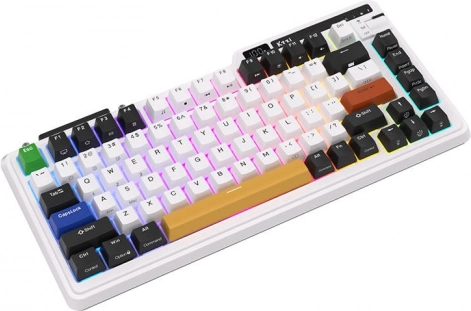 Stilfuldt trådløst mekanisk tastatur Royal Kludge K75 Pro tilbyder et kompakt layout med 82 taster, flerfarvet RGB-baggrundsbelysning, op til 130 timers batteritid og tre typer tilslutning (2,4 GHz, Bluetooth, USB-C). Takket være hot-swap-sokler kan du nemt skifte kontakter, anti-ghosting sikrer pålidelig registrering af tastetryk, og det integrerede display viser batteristatus tydeligt. Et fremragende valg til både arbejde og gaming.