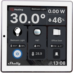 Shelly Wall Display er et centralt betjeningspanel til det smarte hjem med 4" farveskærm og Wi‑Fi/Bluetooth‑forbindelse. Det lader dig hurtigt justere temperatur, luftfugtighed og belysning og viser tydeligt nøgletal om hjemmet. Takket være Shelly Smart Control kan du desuden nemt følge energiforbruget og afsløre unødvendige belastninger.