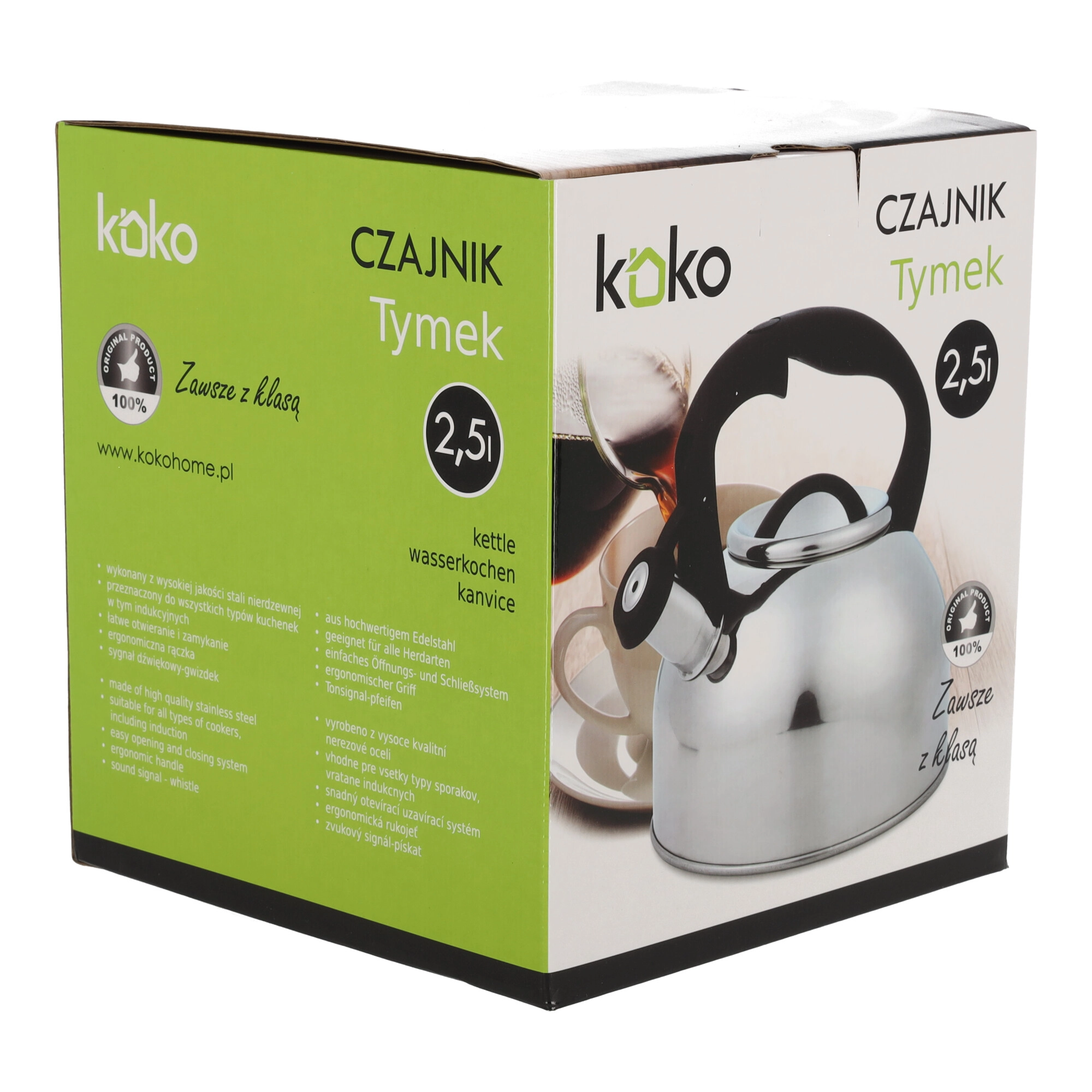 Kedlen KOKO TYMEK med en kapacitet på 2,5 l er et elegant og holdbart supplement til ethvert køkken. Den er fremstillet af rustfrit stål af høj kvalitet, er usædvanligt korrosionsbestandig og konstrueret til at holde længe. Takket være den solide konstruktion og det klassiske design passer TYMEK-kedlen perfekt ind i ethvert køkkenmiljø.