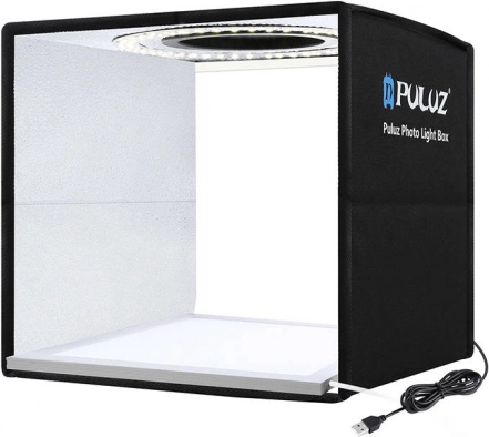 Kompakt mini-fotostudie PULUZ i størrelsen 25 × 25 × 25 cm med ringbelysning på 96 LED (type 2835) og høj farvegengivelse CRI >95 til førsteklasses produktfotografering uden skygger. Tilbyder trinvøs dæmpning 1–100 %, farvetemperatur 5500 K og USB-strømforsyning. Den sammenklappelige konstruktion, top- og frontoptagelse samt 6 dobbeltsidede baggrunde hjælper dig med at opnå perfekte resultater hvor som helst.