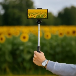 Kompakt selfie-stang og stativ 2-i-1 med aftagelig Bluetooth-fjernbetjening til både Android og iOS. Byder på teleskopisk forlængelse op til 92 cm, 360° roterende telefonholder og stabilt tripod til selfies, gruppebilleder, video, vlogging og videoopkald. Fjernudløser med rækkevidde 10–15 m sikrer skarpe billeder uden rystelser.