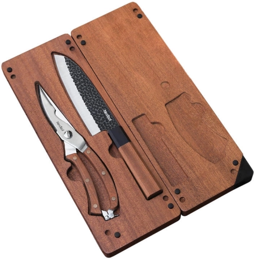 Rustfri knive og saks A Sættet inkluderer en Santokukniv med titanium PVD belægning og en saks af holdbart rustfrit stål, som er ideelle til præcise snit.