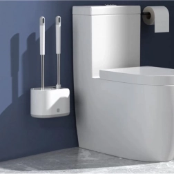 Håndtag i rustfrit stål, hoveder i TPR og PP samt en medfølgende selvklæbende vægholder sikrer lang levetid, nem vedligeholdelse og orden på badeværelset.