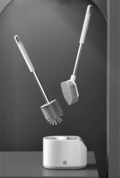Det runde TPR-hoved er fleksibelt og skånsomt mod keramik, mens det flade trekantede PP-hoved med skarp spids rengør selv svært tilgængelige hjørner og kanter under skålens kant.