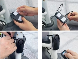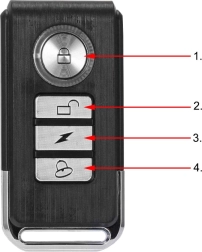 Pakken indeholder en fjernbetjening til nem aktivering og deaktivering af alarmen. Takket være det kompakte design og nem installation kan alarmen hurtigt fastgøres til cykelrammen eller et skjult sted på motorcyklen.
