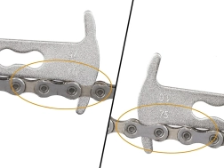 Måleren har tydeligt læsbare markeringer 0,75 og 1,0 – så du nemt kan se, hvornår kæden nærmer sig slutningen af sin levetid, og hvornår en øjeblikkelig udskiftning er nødvendig.