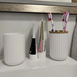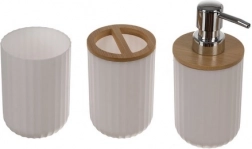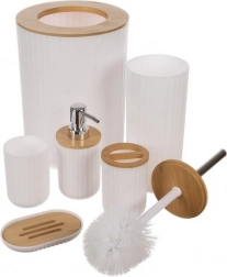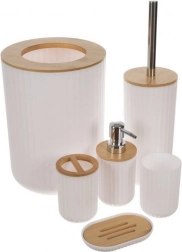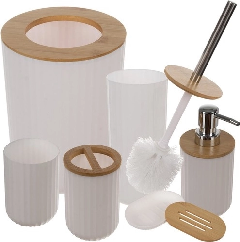 Dette komplette sæt indeholder en affaldsspand, toiletbørste med holder, sæbedispenser, krus, krus til tandbørster og sæbeskål. Takket være kombinationen af PP-plast, ABS, bambus og rustfrit stål tilbyder det fremragende fugtbestandighed og lang levetid. Den hvide riflede overflade med bambusdetaljer giver dit badeværelse et moderne og naturligt præg.