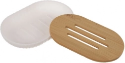 Dispenser med forkromet pumpe og sæbeskål med bambusindsats holder orden ved håndvasken, sikrer afvanding af sæben og et rent look.