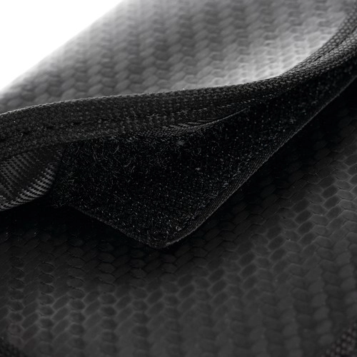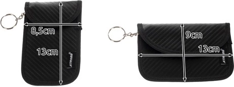 Hvert etui har to separate lommer – en dybere med ring til bilnøglen (afskærmet), og en mindre til betalings- og adgangskort. Den holdbare PU-overflade i karbon-look, blød polstring i polyester og stærk velcro beskytter indholdet mod skader og utilsigtet tab. Sættet indeholder en vertikal og en horisontal variant; den horisontale version har desuden et bagbeslag til fastgørelse i taske eller rygsæk.