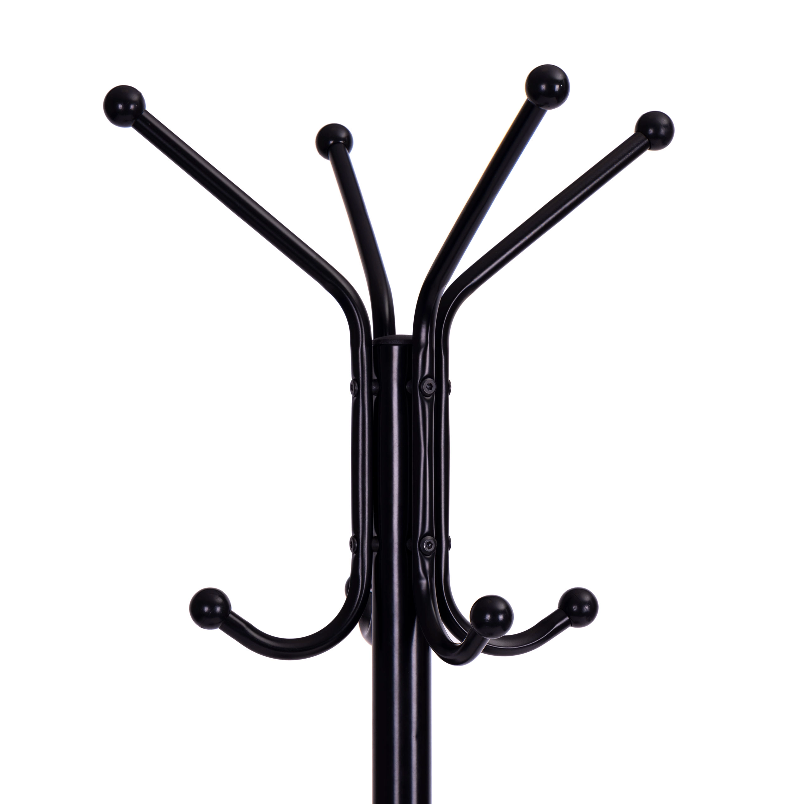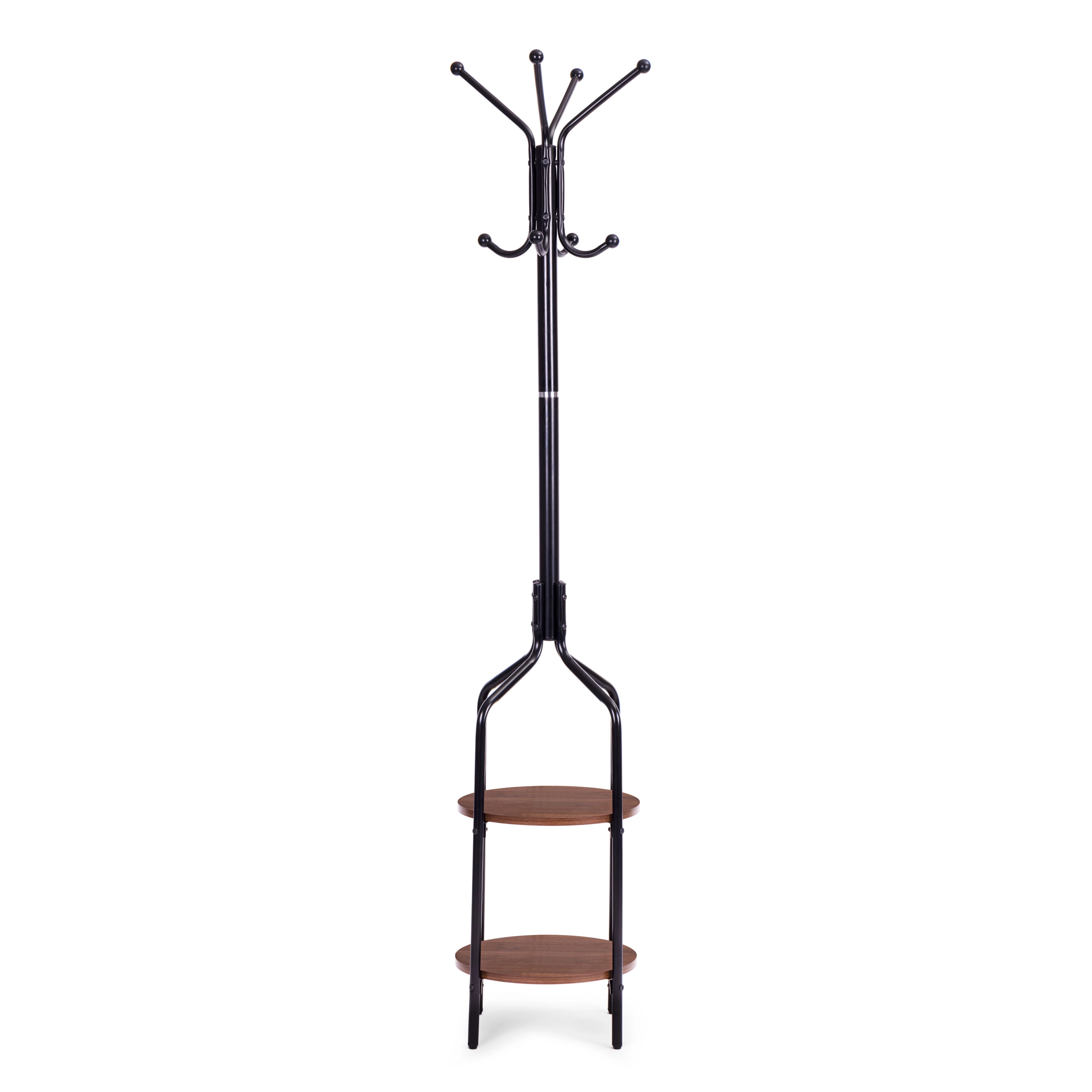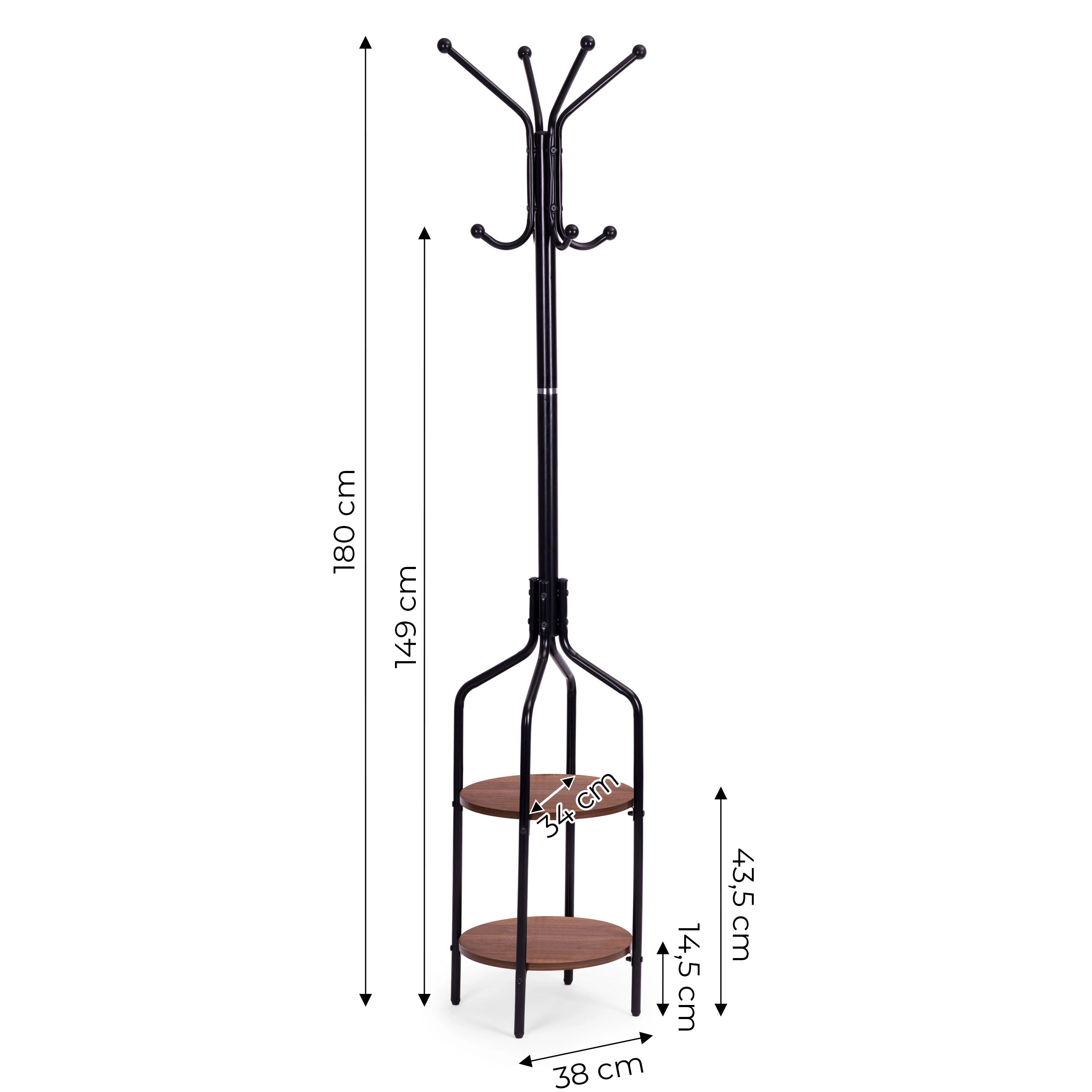 Den øverste del har fire arme, som giver 8 pladser til at hænge tøj. Den nederste del er udstyret med to funktionelle hylder i rustik brun. Konstruktionen er lavet af pulverlakeret metal, og basen af 4 udvidede ben, som sikrer stabilitet selv ved høj belastning. Hvert ben afsluttes med en fodpude, der beskytter dit gulv mod ridser.