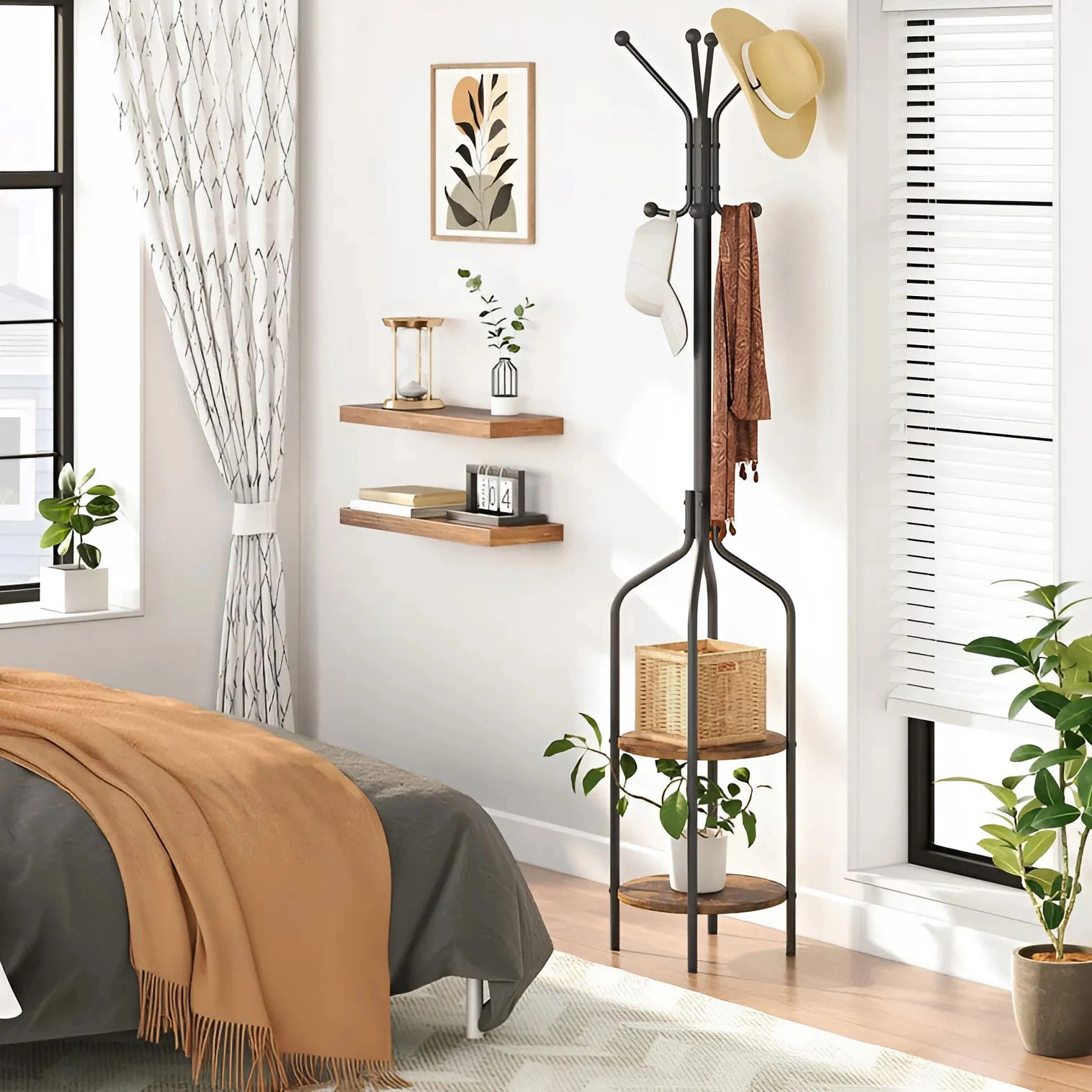 Kombinationen af elegant sort og rustik brun gør stativet til et stilfuldt element i enhver indretning.