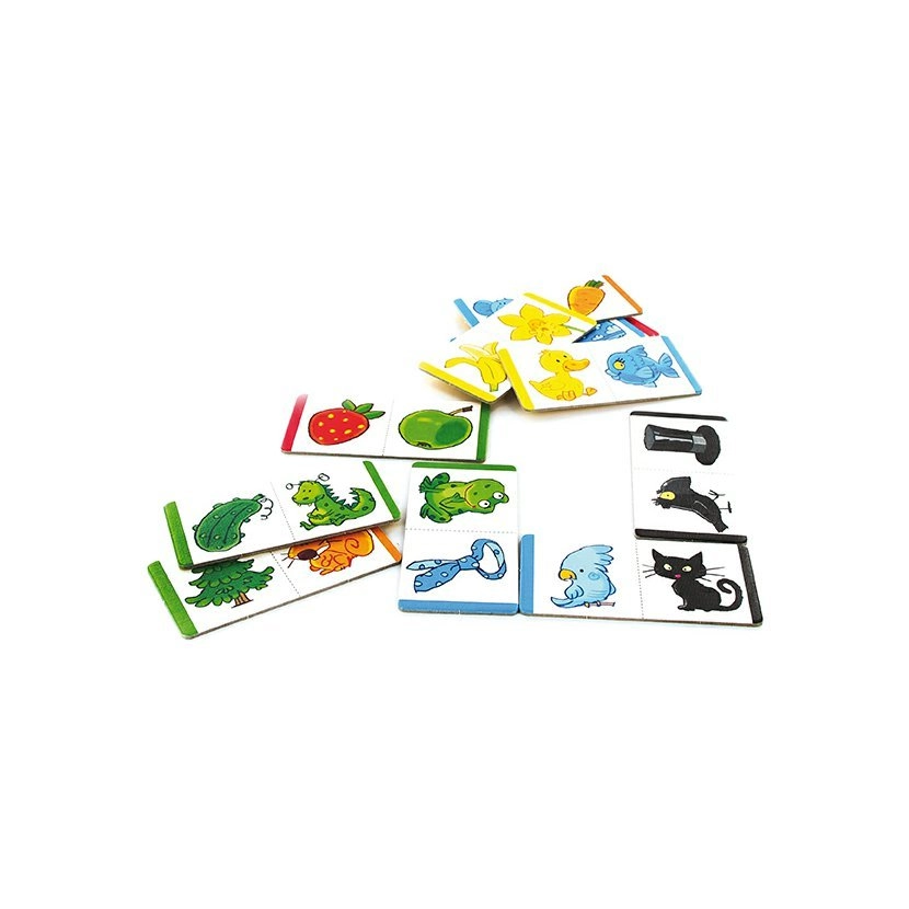 I æsken finder du 27 kort, som nemt forbindes. Reglerne indeholder varianter for én eller flere børn, så der kan spille 1–4 spillere, både i korte og længere spil alt efter humør. Dominoen er en del af serien MINE FØRSTE SPIL og er anbefalet af logopæder som et lærende og underholdende redskab.
