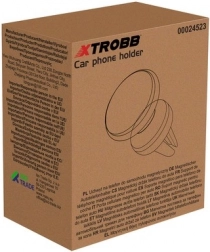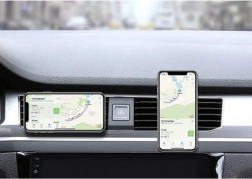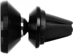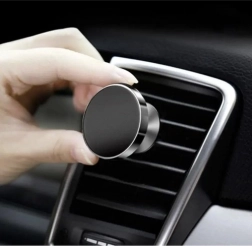 Holderen skubbes nemt ind i ventilationsristen. De silikonebelagte kæber holder stabilt og skånsomt mod overfladen; det er nok at føre telefonen tæt på, så låser magneterne den straks fast.