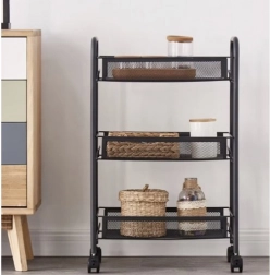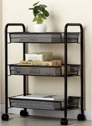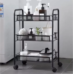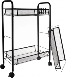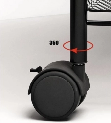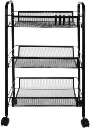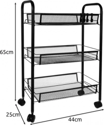 Hold orden med stil. Denne kompakte, men stabile reol i pulverlakeret jern er designet til daglig brug. De åbne kurvehylder giver overblik og god ventilation, ideelt til madvarer, kosmetik og rengøringsmidler. Fire kvalitets hjul giver glidende flytning, hvoraf to har integreret bremse for sikker placering.