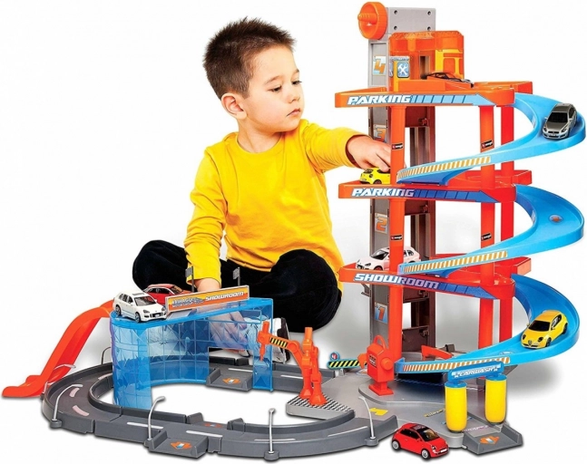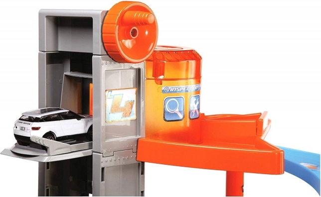 Denne fleretagers Bburago-garage med vaskehal gemmer på mange funktionelle elementer! Kør den lille bil op med elevatoren helt til det øverste etage i garagen, og lad den suse ned ad vejen! Kig forbi værkstedet, vask bilen i vaskehallen, og kør gennem de hæve-sænke bomme!