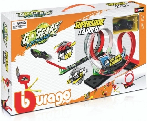 Racerbanen Bburago GoGears Extreme SuperSonic Launch 3-i-1 giver børn mulighed for at opleve hæsblæsende stuntkørsel. Kør gennem flere loops, få fart på på langsiderne, og forsøg at ramme målet præcist fra rampen. Med tre layoutmuligheder tilpasses banen nemt efter kørestil og plads i børneværelset.