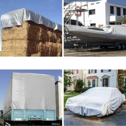 Ideel som beskyttelse mod regn og sol til biler, både, last, brænde eller byggeplads. Dobbeltsiddet presenning i sølv-/grå farve.